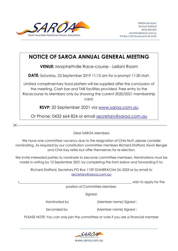 The SAROA AGM for 2021 is booked for September 25th in the Leilani Room at Morphettville